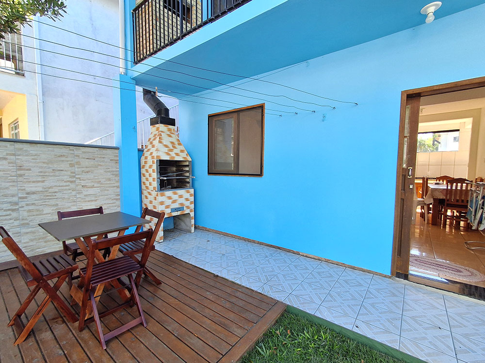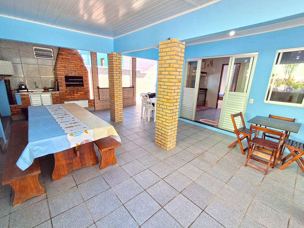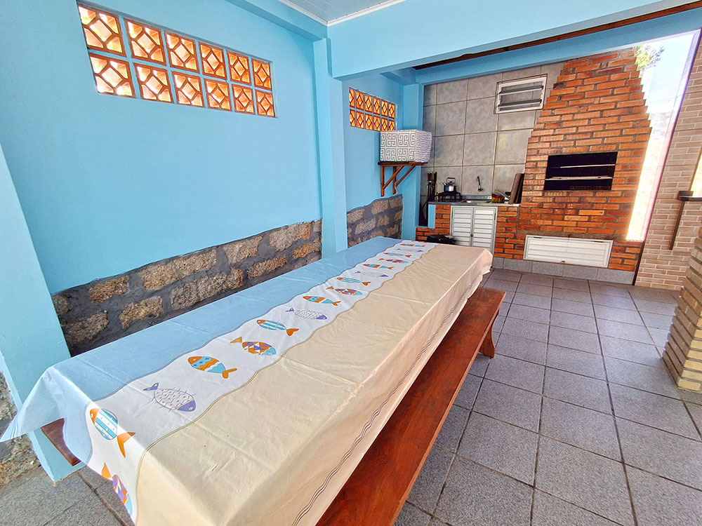 - Área externa coberta (com churrasqueira, gancho para 4 redes, mesa para churrasco com bancos, pia, mesa de plástico com cadeiras e 01 banheiro social)