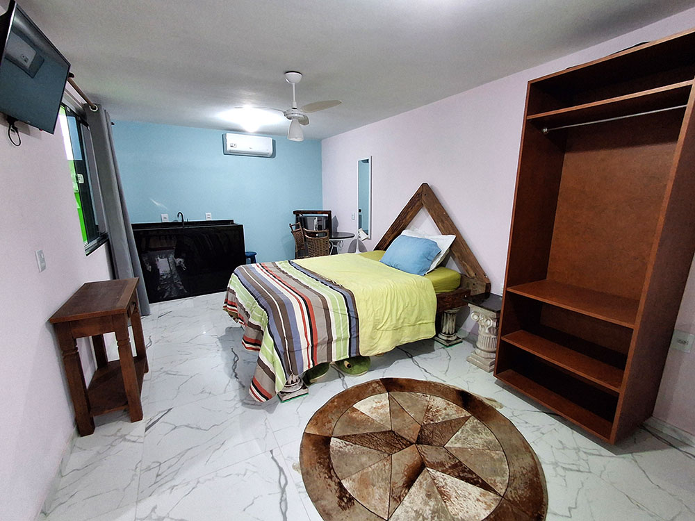 Oferecemos também a opção de uma suíte exclusiva para casal (no piso superior), disponível para locação independente, equipada com: