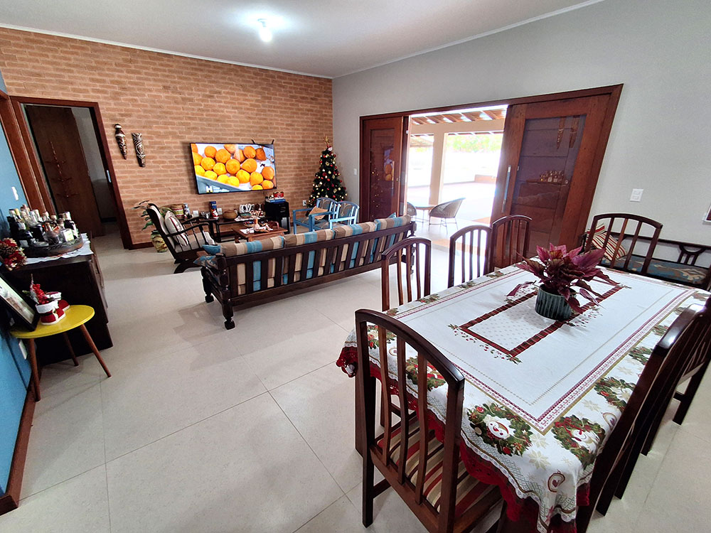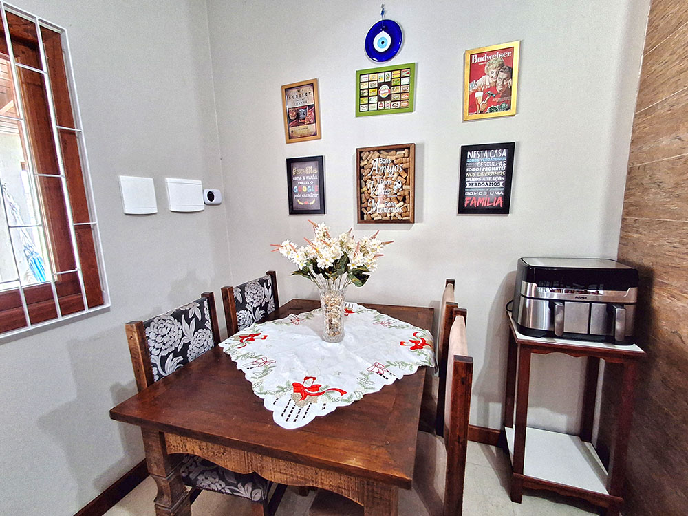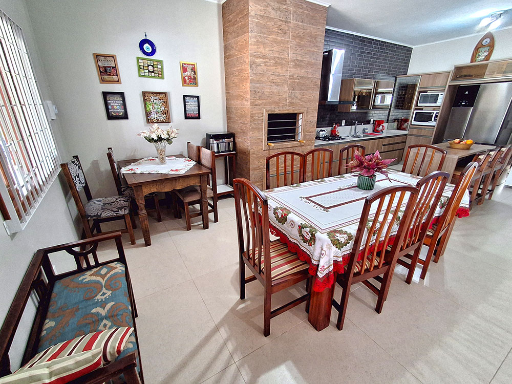 - Cozinha completa (com geladeira duplex, microondas, forno elétrico, liquidificador, air fryer, sanduicheira, cafeteira, churrasqueira, espetos e grelha)