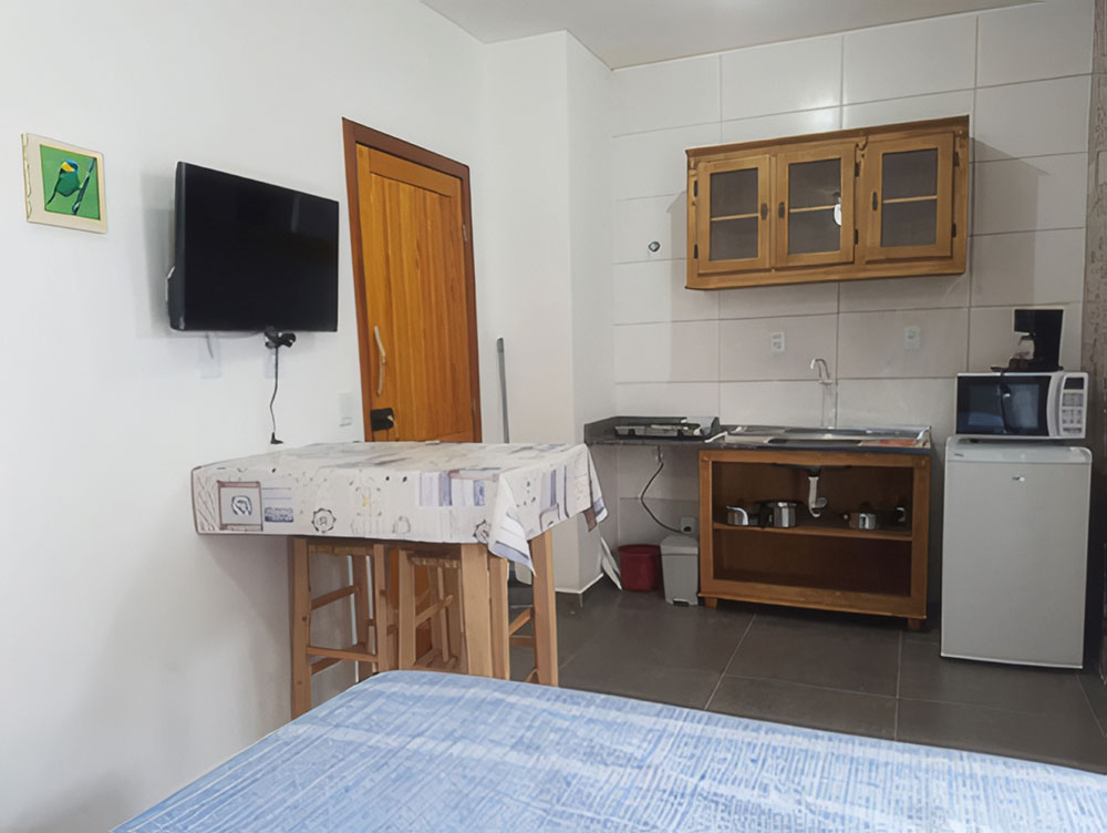 - Mini cozinha com fogão elétrico, micro-ondas, cafeteira e geladeira