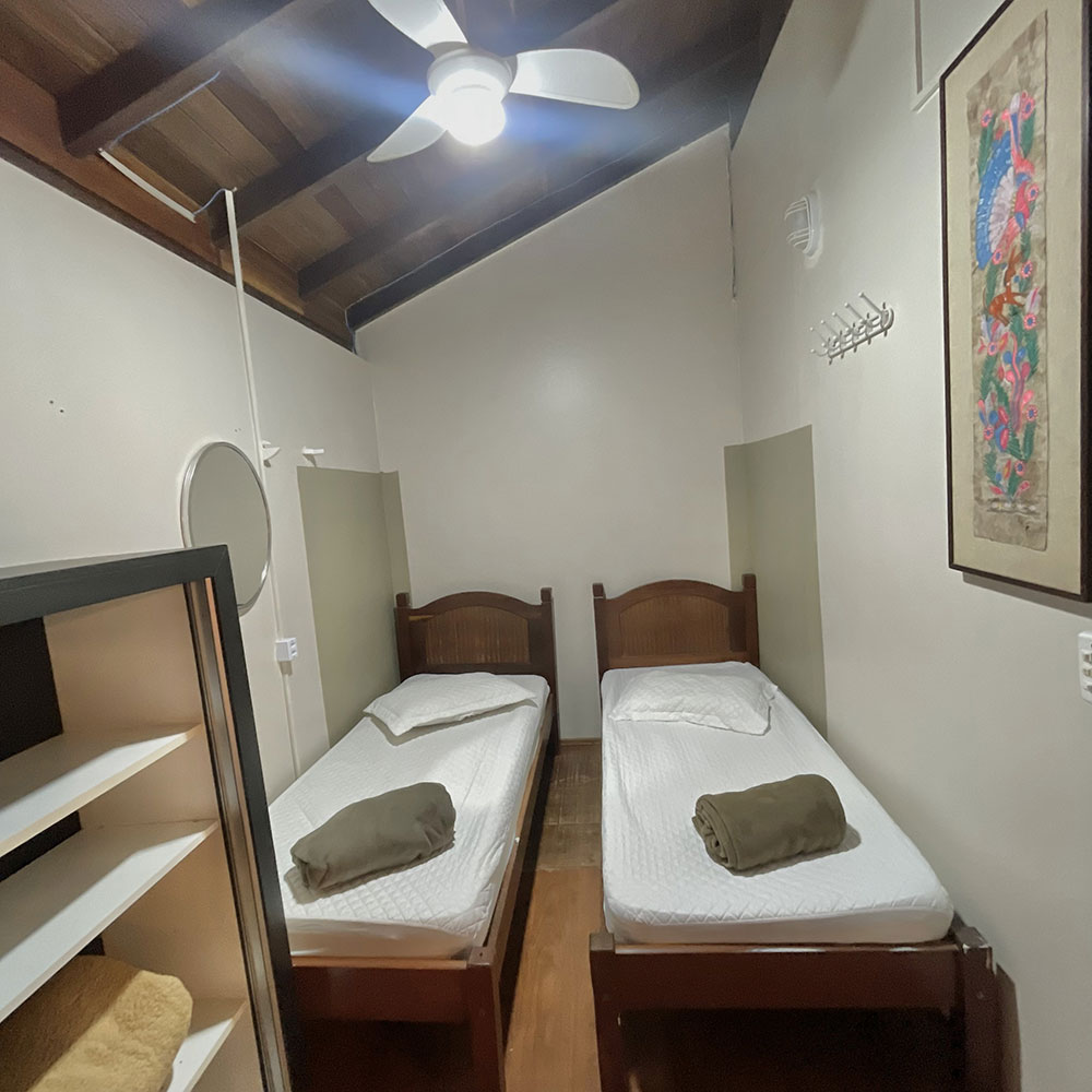 1 mezanino com 2 camas de solteiro, sofá-cama de casal e ventilador de teto