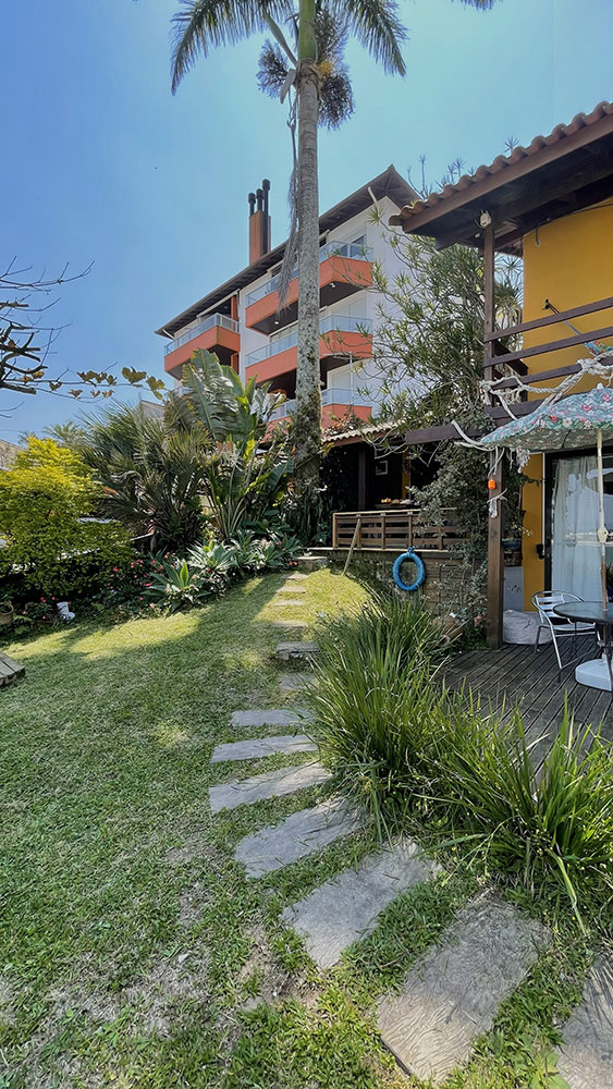 Gramado amplo em frente à casa com deck praticamente dentro da praia (área comum)
