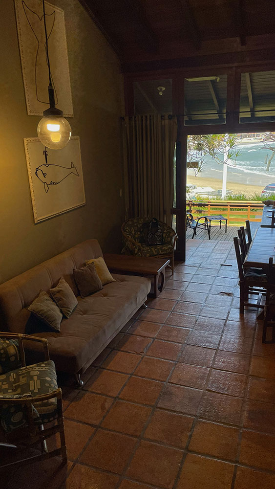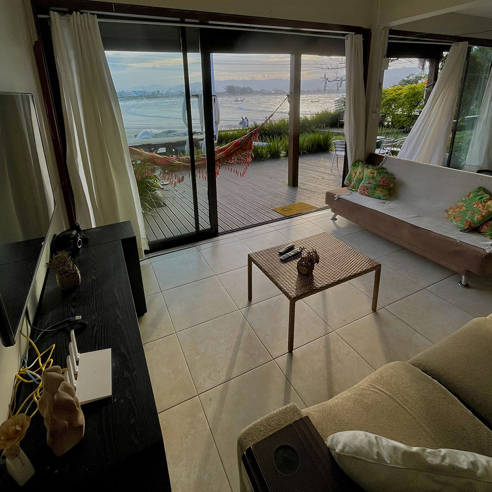 Sala ampla envidraçada com vista para o mar e sofá-cama