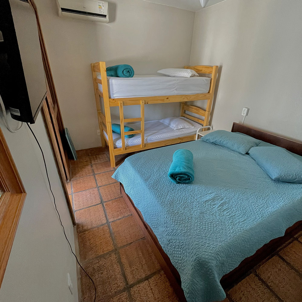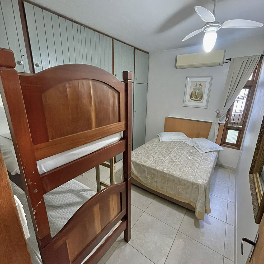2 quartos, sendo 1 com cama de casal e beliche, e outro com cama de casal e sofá-cama