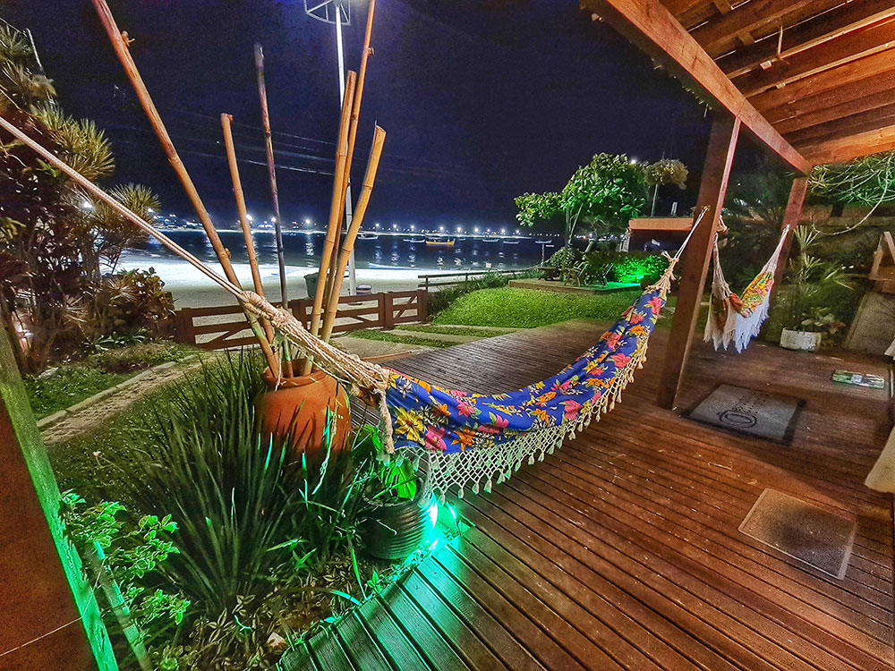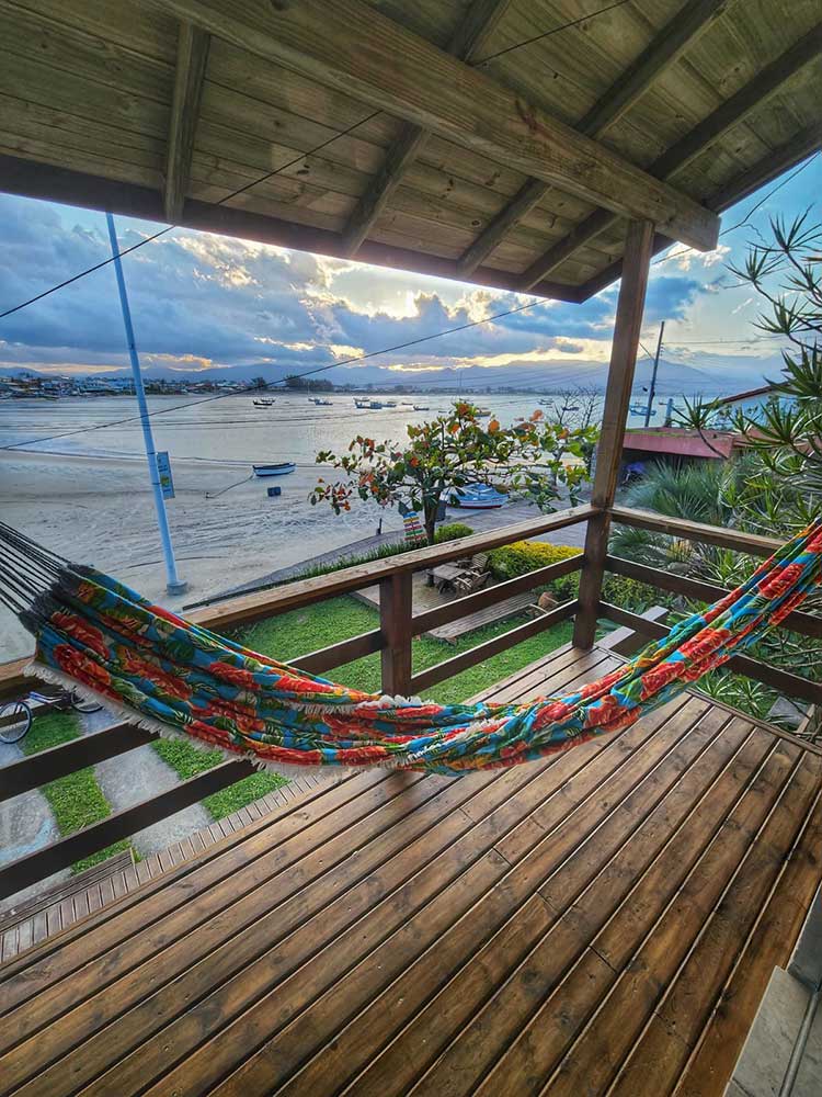 Sacada com rede e vista para o mar, pôr do sol em frente à casa