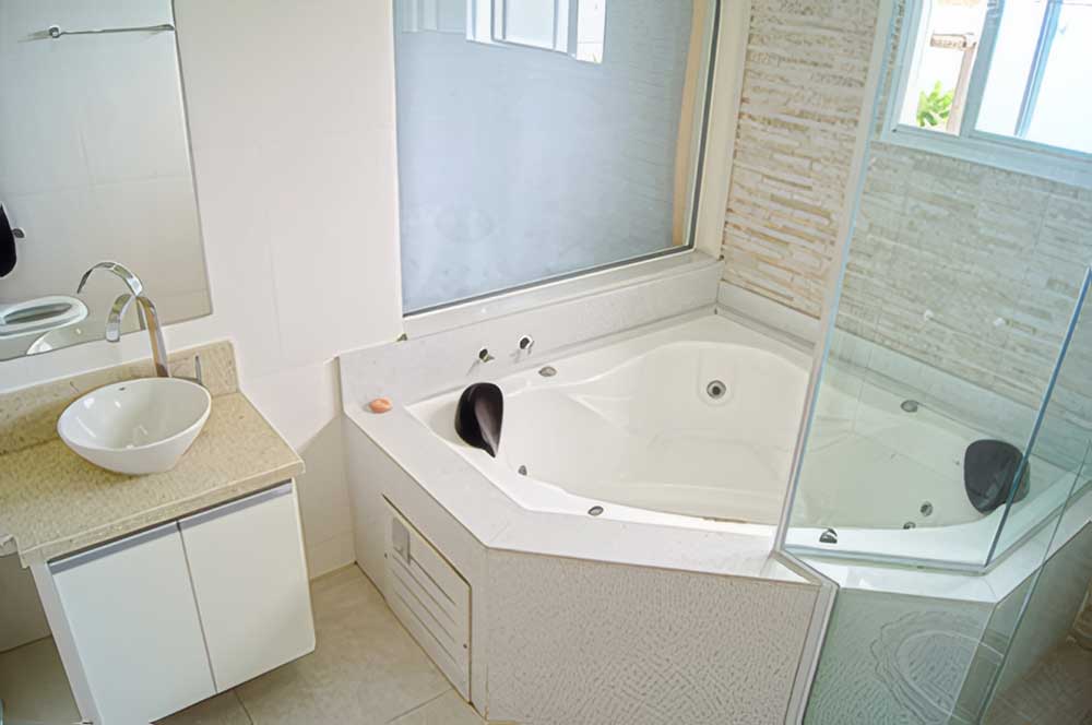 - 04 dormitórios (quarto 1: suíte com banheira de hidromassagem; quarto 2: cama de casal; quarto 3: cama de casal + cama de solteiro; quarto 4: cama de casal; todos com ar condicionado)