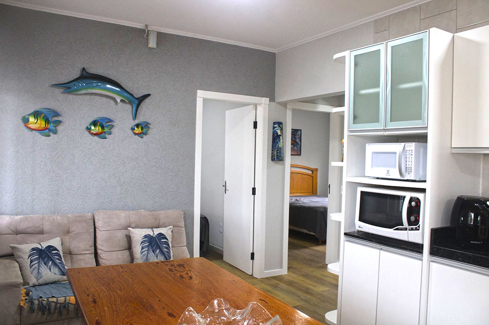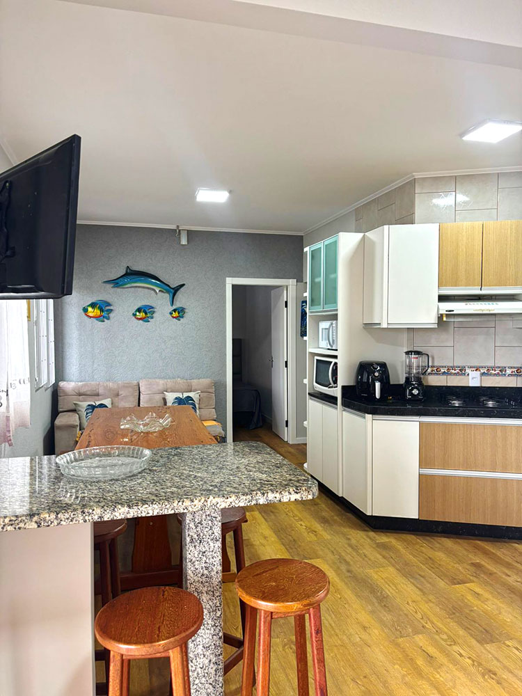 - Cozinha completa (com geladeira duplex, microondas, air fryer, forno elétrico, cafeteira, liquidificador, chaleira elétrica e bebedouro refrigerado)